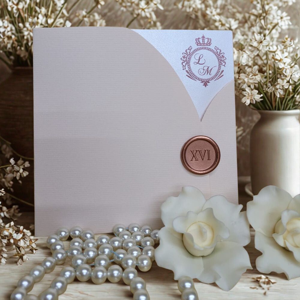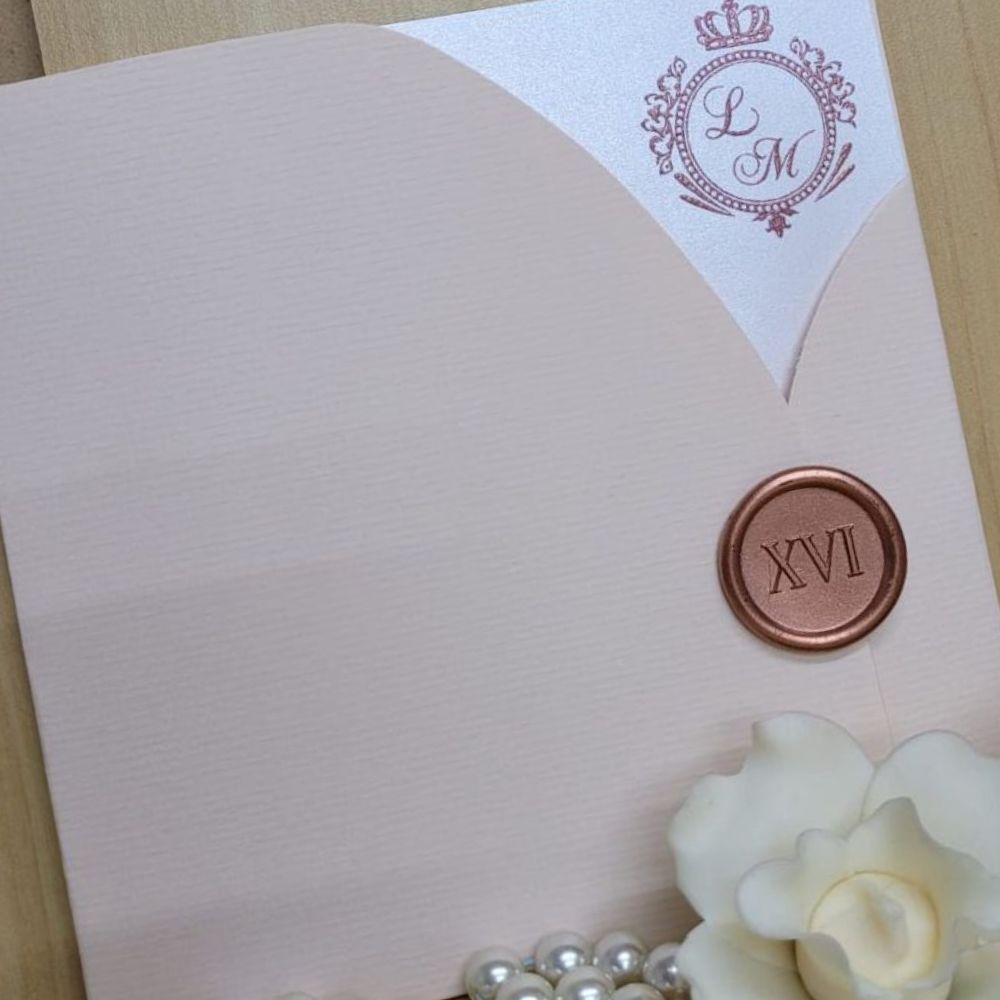 O convite de 15 anos é muito mais do que um simples papel com informações. Está planejando uma festa de 15 anos inesquecível? Seus convidados merecem um convite à altura desse momento tão especial. Conheça nossos convites de 15 anos personalizados em papel nude rosé, com impressão em rose gold, envelope aspem e finalização com lacre de cera elegante.