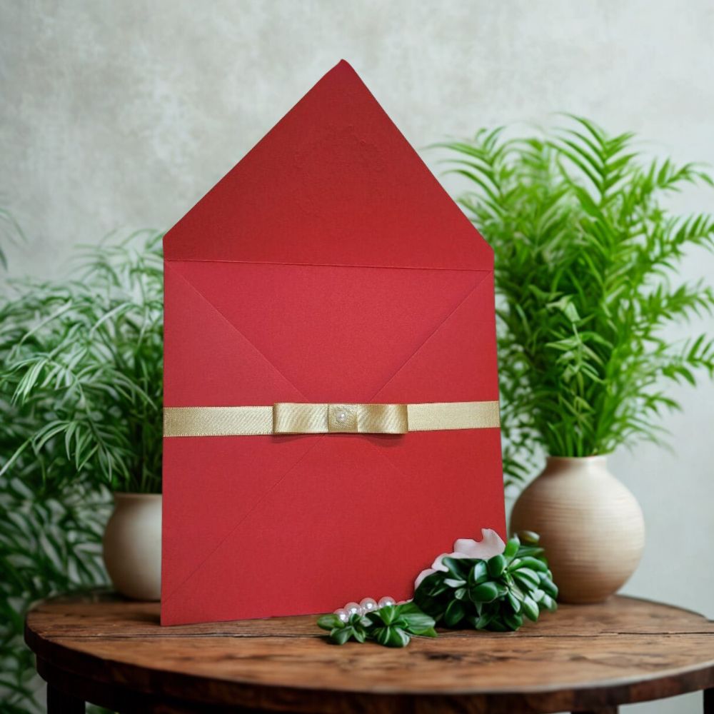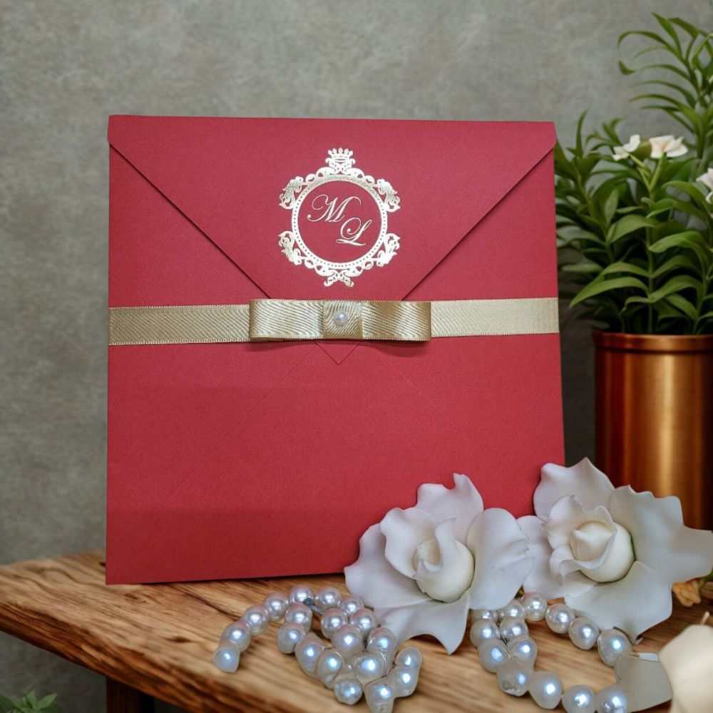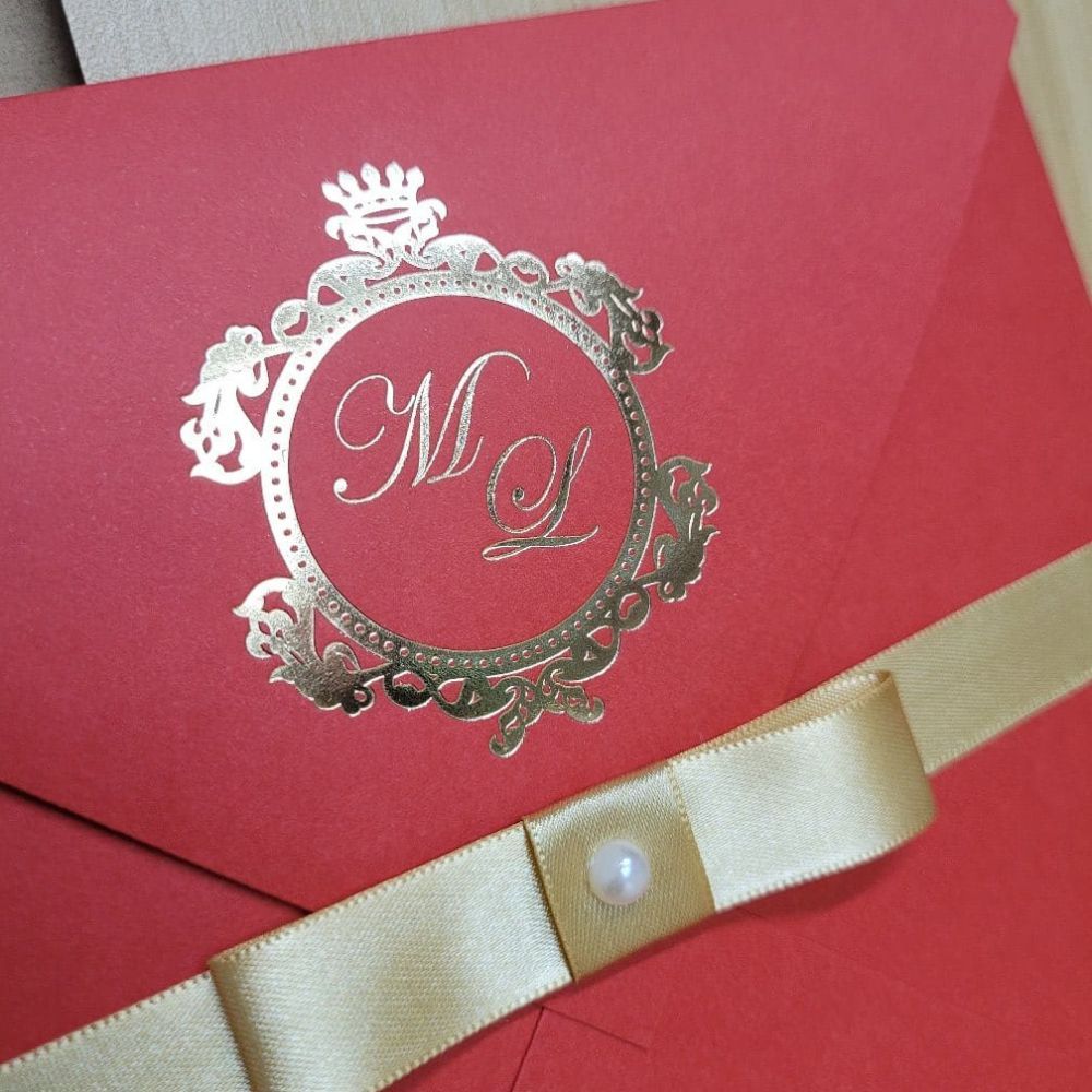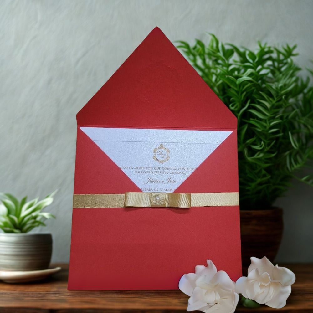 Encante seus convidados com um convite de 15 anos que une luxo, sofisticação e personalidade. Produzido em papel vermelho Tóquio, este modelo possui um brasão em hot stamping dourado, finalizado com uma elegante fita de cetim dourada.