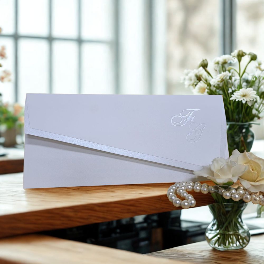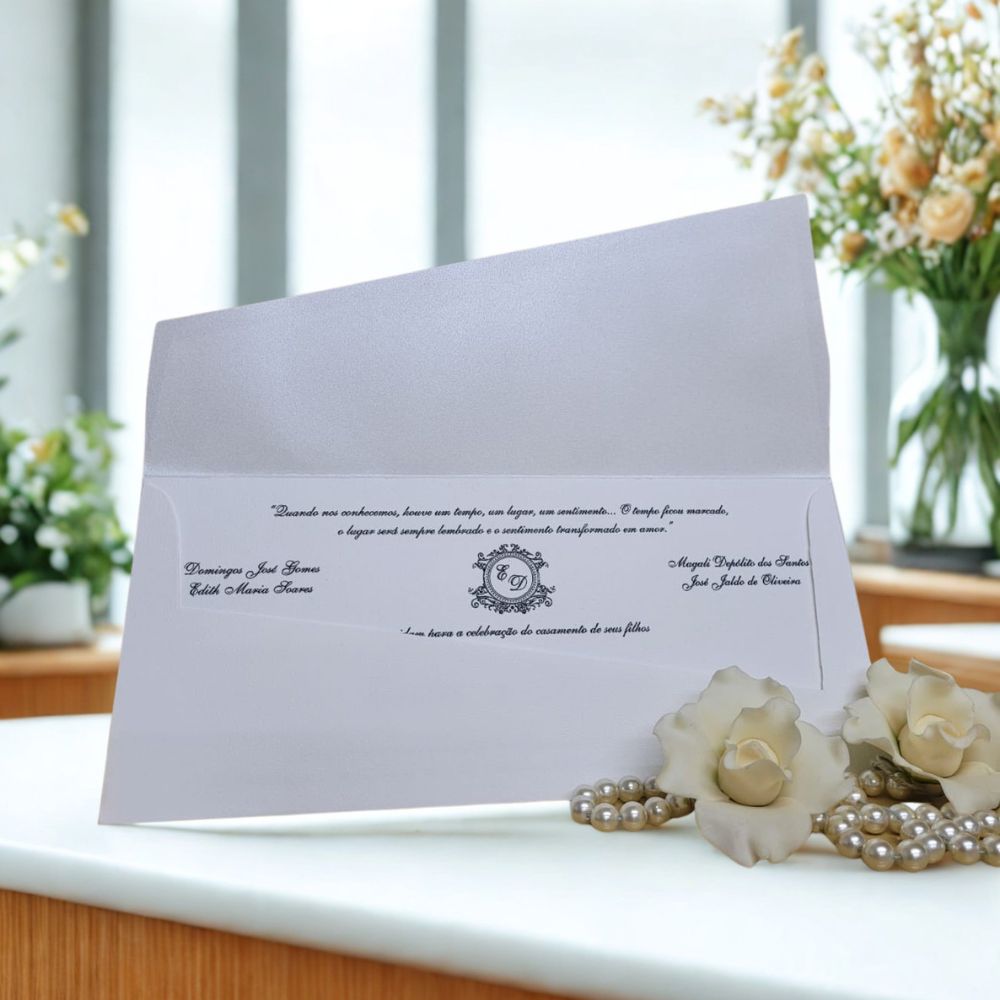 Papel envelope: Casca de Ovo 180 grs com iniciais em hot pérola (fonte padrão Sheley)